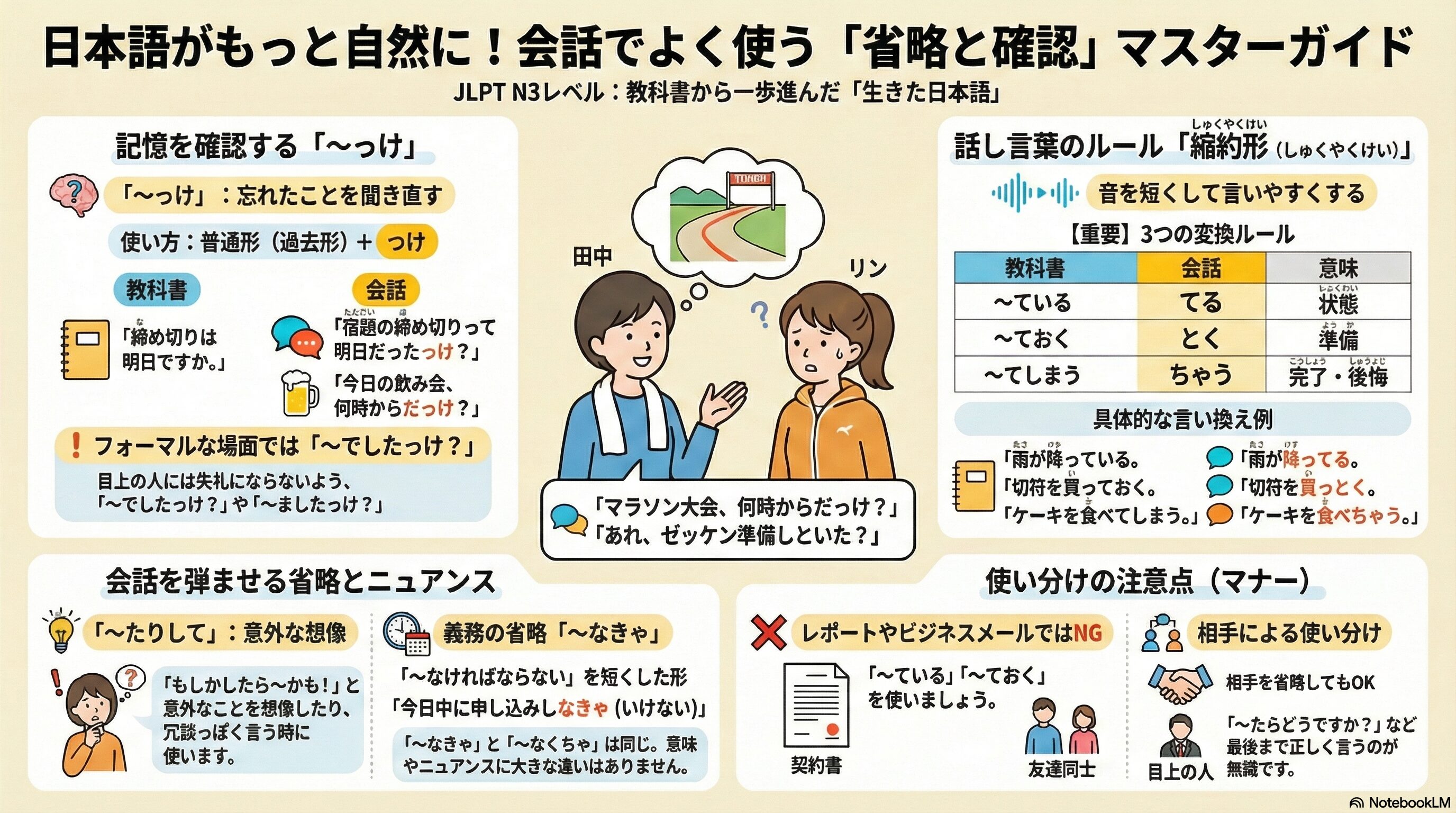 教科書で習う丁寧な日本語も大切ですが、友達や同僚との会話では、もっと短くて自然な表現がよく使われます。音が変わったり、最後まで言わなかったりする「生きた日本語」を身につけることで、リスニング力も会話力も一気にアップします!今日はマラソン大会を控えた二人の日常会話から、重要なポイントを学びましょう。